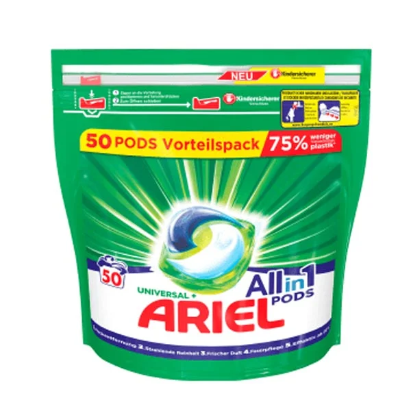 Ariel Clothe Wash All In 1 Universal and Pods 50Tab , they deliver super concentrated cleaning power. The innovative layer of the Ariel washing tablets dissolves completely on contact with water and releases their powerful cleaning power that fights a variety of stains and gives you just the right amount of Ariel’s best liquid detergent.