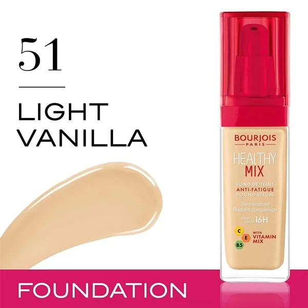 - Bourjois Foundation 30ml Healthy Mix N51 Light Vanilla ,Ready to play with makeup? In Paris, beauty is magic, not a chore, Bourjois can easily create an elegant look on the eyes, lips, face and nails with a cool and eye-catching Parisian touch. Say Bonjour to beauty with enthusiasm for life.