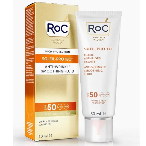 - RoC Soleil Protect 50ml Anti Wrinkle Smoothing Fluid Spf 50 , ROC Sun-Protect High tolerance fluid SPF50 + comforts sensitive skin and preserves its youth.