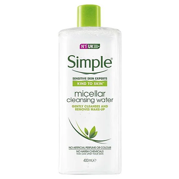 - Simple Micellar 400ml Cleansing Water Make Up Remover , A cleansing water with micelles, clever cleansing bubbles which are smart enough to gently lift make-up and impurities out and unclog pores while working as a makeup remover which thoroughly cleans and removes makeup without irritation. Our Simple® Micellar Water not only instantly boosts skin’s hydration by 90%, it also cleanses without greasy residue and no rinsing required. Your skin will feel clean, fresh and instantly hydrated. Designed for sensitive skin, perfect for all skin types, our Simple® Micellar Cleansing water is made with skin-loving ingredients including vitamin B3, vitamin C and Triple Purified Water – our purest water that provides instant hydration to help the skin get through the day. The many beauty benefits of Micellar Water make it easy to see why this gentle facial cleanser should be part of your healthy skincare routine, it contains no artificial perfumes or colours and no harsh chemicals that can upset your skin. It’s also made from a gentle formula that is in balance with skin’s natural pH level. Dermatologically tested and approved, our Simple micellar water can be used as your daily cleanser. The only difference is that there’s no need to rinse after you use it. You can use it as a first step to gently cleanse and remove make-up. Alternatively, you can also use it after washing your face with a sensitive face wash to give your skin a thorough cleanse. After use, you can continue with your usual skin care routine, Apply with a cotton round to cleanse skin with no residue and no rinsing required – skin is left clean and refreshed in one easy step!